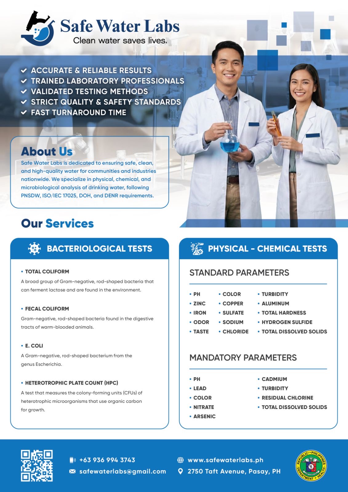 Safe Water Labs is dedicated to ensuring safe, clean, and high-quality water for communities and industries nationwide. We specialize in physical, chemical, and microbiological analysis of drinking water, following PNSDW, ISO/IEC 17025, DOH, and DENR requirements.